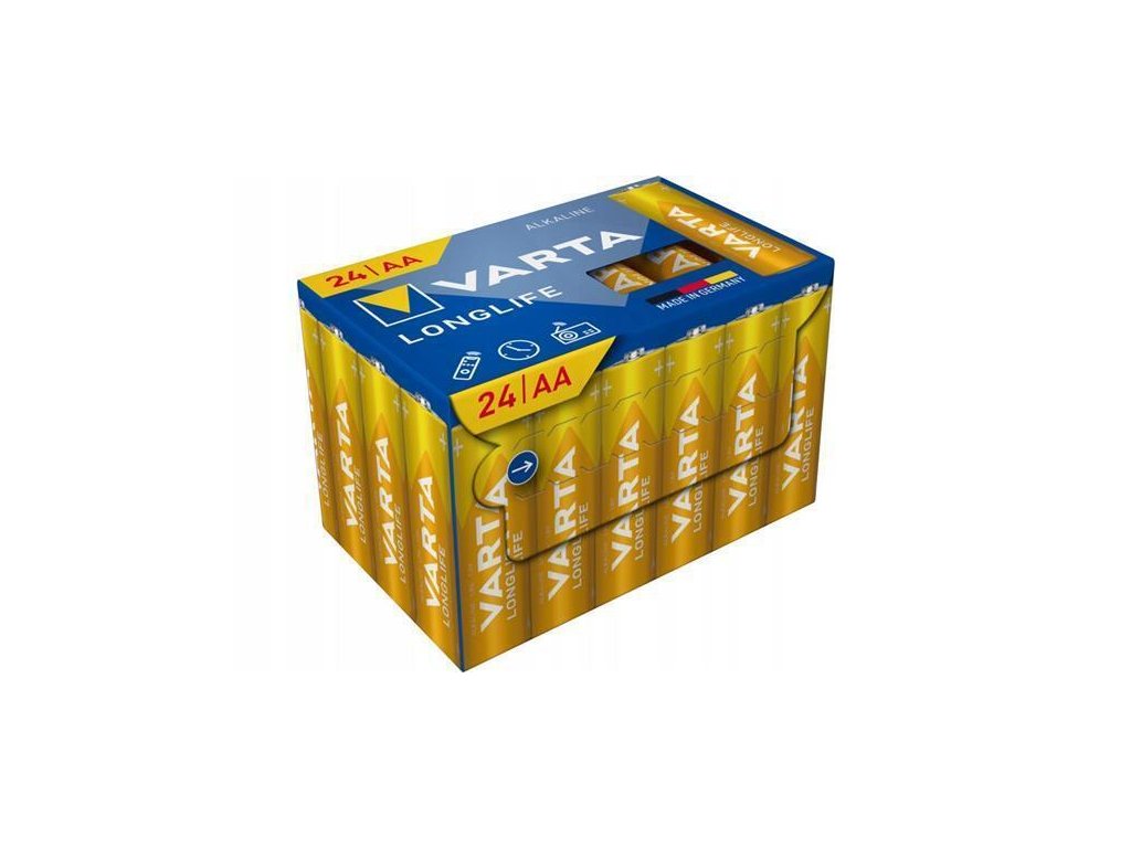 VARTA "Longlife" je baterie s dlouhou životností pro zařízení s nízkým odběrem.Energie s dlouhou životností pro zařízení s konstantní a nízkou spotřebou energie, např. dálkové ovladače pro TV a hudební systémy, nástěnné hodiny, rádia atd.Obal bez plastuVelikost baterie: AANorma IEC: LR6Napětí: 1,5 VChemické složení: AlkalickéBalení: 24 ksKontaktní informace výrobce/prvního distributora v EU:VARTA Consumer Batteries GmbH & Co.Alfred-Krupp-Str. 9, Ellwangen 73479, DEinfo@varta-household.comDoplňkové parametry