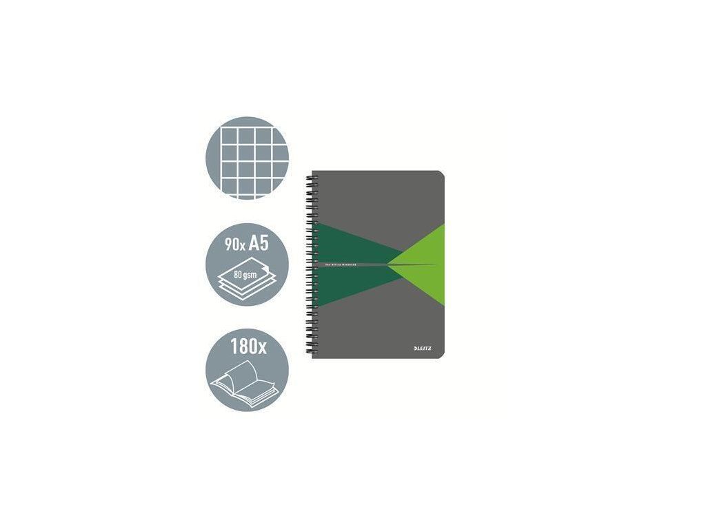 Blok "Office", šedo-zelená, drátěná kroužková vazba, A5, čtverečkovaný, 90 listů, laminované desky,
