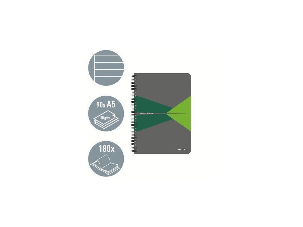 Blok "Office", šedo-zelená, drátěná kroužková vazba, A5, linkovaný, 90 listů, laminované desky, LEIT