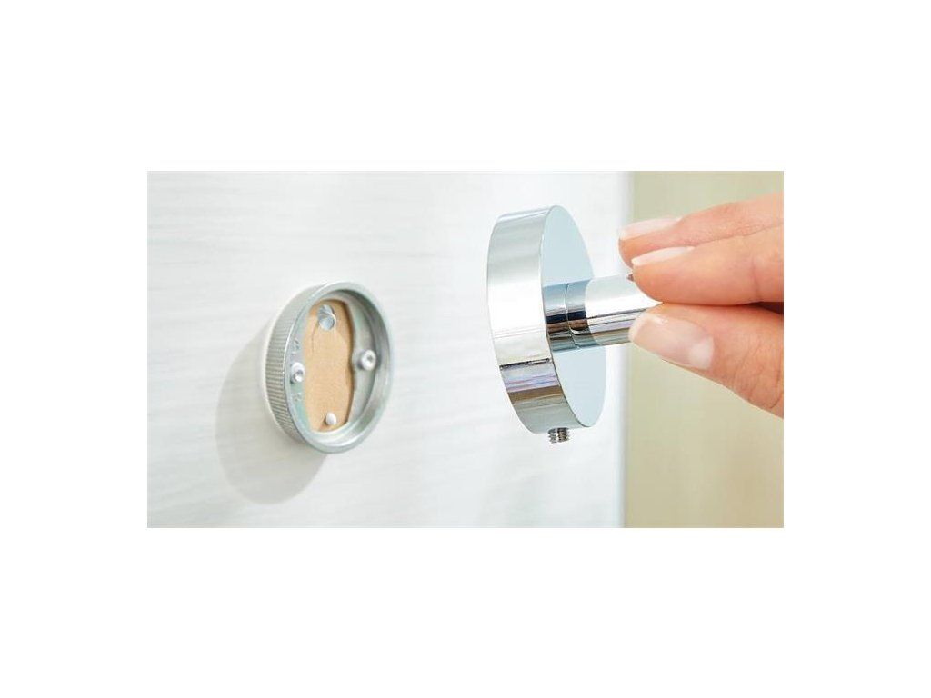 Samolepicí dávkovač mýdla na ruce, který nevyžaduje žádné vrtání.Pochromovaný kov s vysokým leskem, zaoblené provedení, kruhová nástěnná podložka, saténové sklo