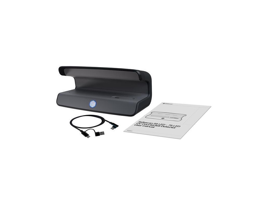 Balení obsahuje: Safescan 55 LED, napájecí kabel USB-C, adaptér USB-A, návod k použití