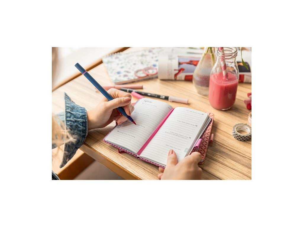 Stylový diář Jolie, je uzavíratelný na gumičku, vybavený praktickou papírovou kapsou na zadní straně a poutkem na pero.Kromě přehledného diáře, obsahuje měsíční a roční plánovač pro 2025/2026