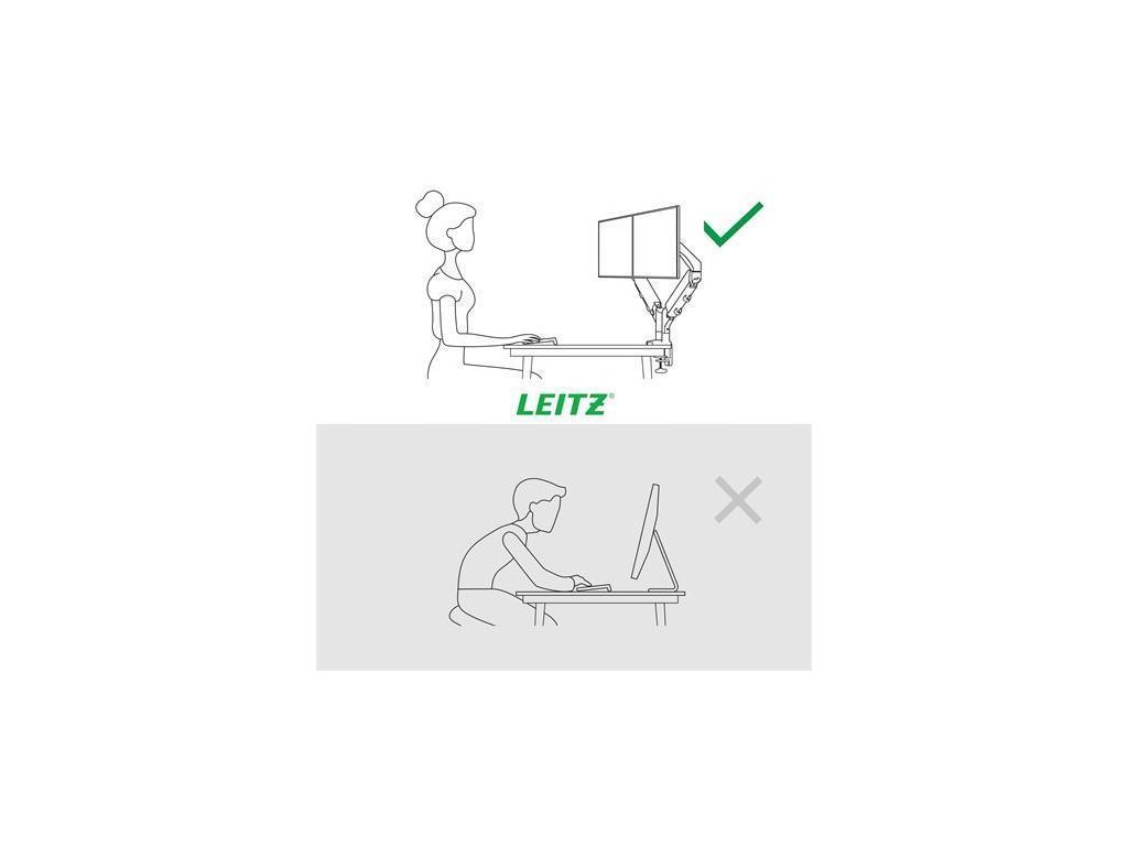 Leitz úsporný duální držák monitoru má pozitivní vliv na držení těla a podporuje pohodlí krku, ramen a očí, pokud jsou monitory nastaveny do správné a doporučené ergonomické polohy.V jakékoli výšce a úhlu zůstává stabilní a snadno s ním přepnete mezi vertikálním a horizontálním nastavením monitoru