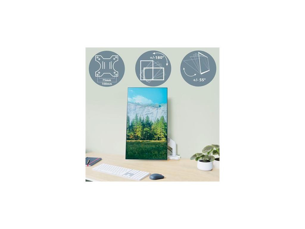 Snadná instalace díky přiložené rychloupínací, odnímatelné desce VESA (75 a 100 mm) a silikonem pogumovanému U-tvarovanému svorkovému úchytu, který tlumí vibrace a chrání povrch stolu, nebo montáží přes otvor ve stole (rozsah tloušťky desky: 10–80 mm)
