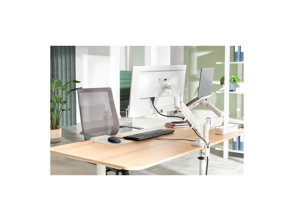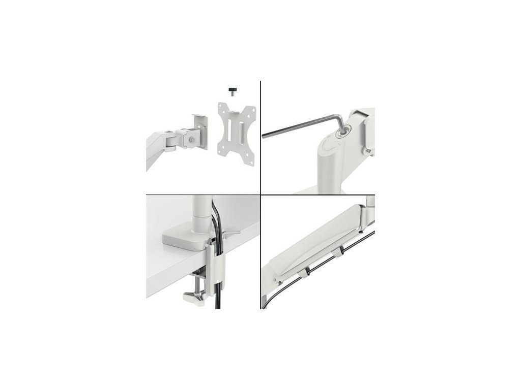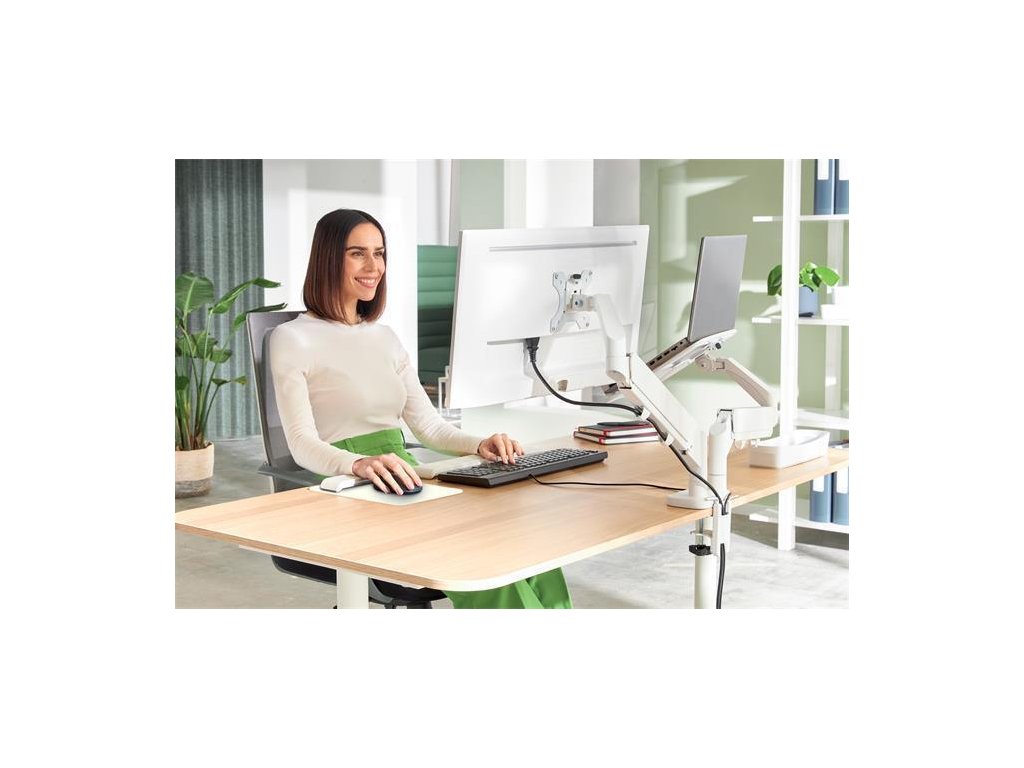 Snadná instalace díky přiložené rychloupínací, odnímatelné desce VESA (75 a 100 mm) a silikonem pogumovanému U-tvarovanému svorkovému úchytu, který tlumí vibrace a chrání povrch stolu, nebo montáží přes otvor ve stole (rozsah tloušťky desky: 10–80 mm)