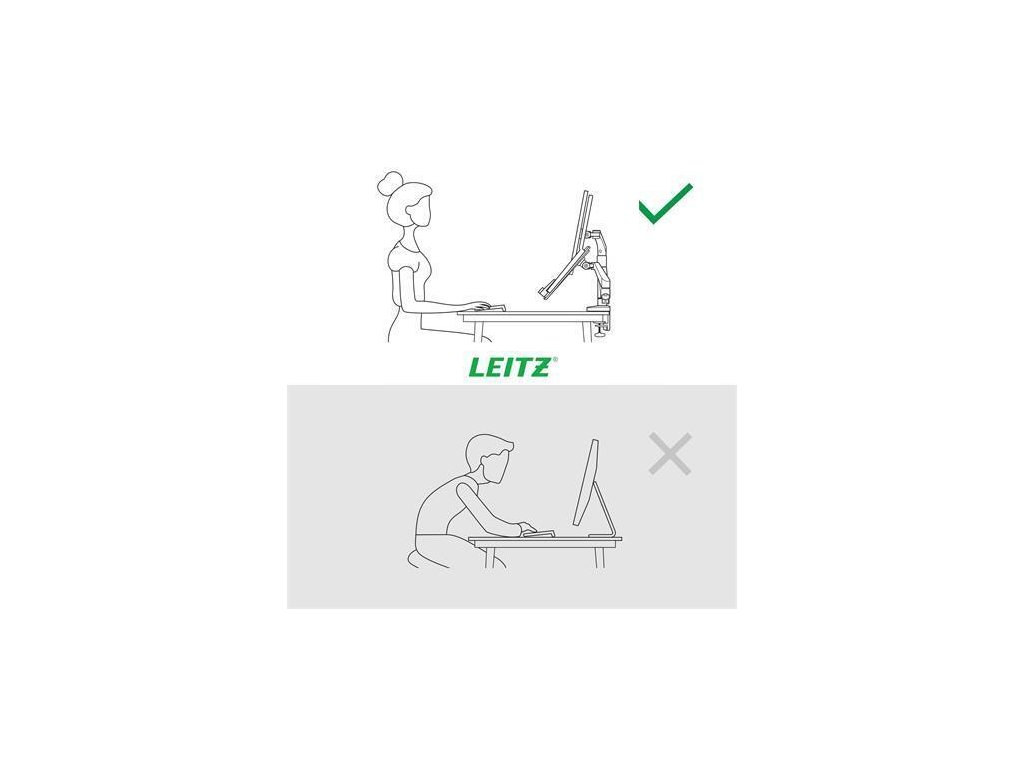 Leitz úsporný držák monitoru a notebooku má pozitivní vliv na držení těla a podporuje pohodlí krku, ramen a očí, pokud jsou monitor a notebook nastaveny do správné a doporučené ergonomické polohy.V každé výšce a úhlu zůstává stabilní