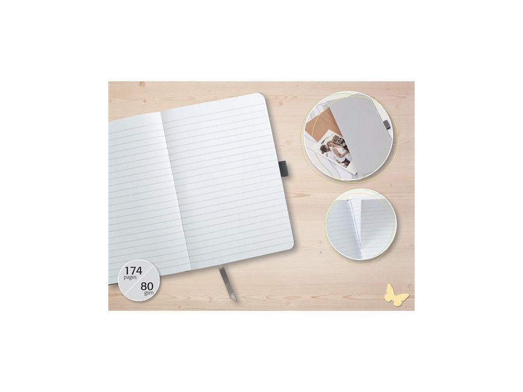 Exkluzivní zápisník Jolie je uzavíratelný na gumičku, vybavený záložkou, poutkem na pero a praktickou kapsou na zadní straně. Posledních 16 stran je perforovaných. Zápisník má tvrdé, matné desky s lesklými detaily.Vazba: pevná, vázaná