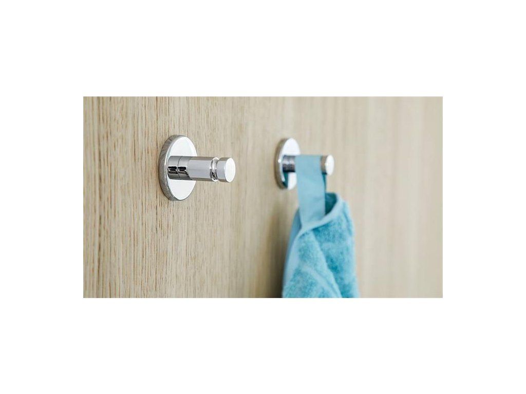 Koupelnový háček s patentovanou technologií tesa® Power.Kit (univerzální montážní řešení pomocí lepidla)Pochromovaný kov s vysokým leskem, zaoblené provedení, kruhová nástěnná podložka, válcovité tělo