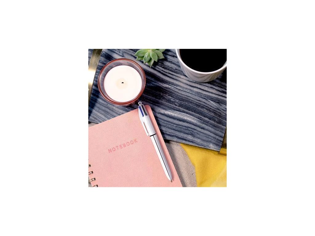 Kuličkové pero BIC 4 Colours Shine, se stiskacím mechanismem. Možnost zavěsit na šňůrku.Nadčasový design