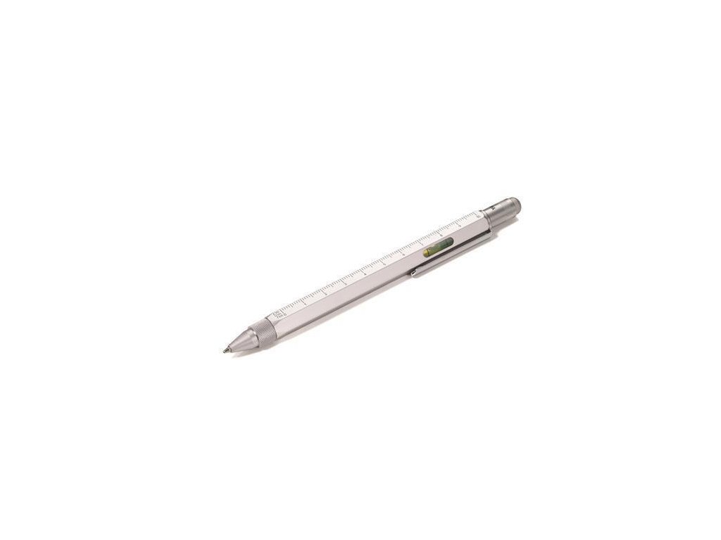 Multitaskingové kuličkové pero ve stříbrné barvě nabízí mnoho funkcí.Funkce: různé stupnice, pravítko s jednotkami centimetr/palec, štěrbinový šroubovák, stylus, vodováha.