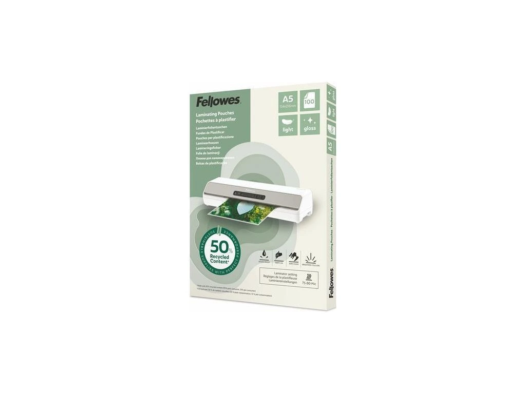 Laminovací fólie "Light" jsou vyrobeny z 50 % recyklovaného materiálu (min. 35 % post-consumer – znovu použitý materiál, 15 % pre-consumer – výrobní odpad) a zajišťují perfektní laminaci se sníženým dopadem na životní prostředí.Lehké provedení (Light Duty) – pro použití při nastavení laminace 75/80 mikronůTloušťka: 80 mikronůFormát: A5Povrch: lesklýBalení: 100 ksKontaktní informace výrobce/prvního distributora v EU:Fellowes Holdings B.V.Gesworenhoekseweg 3, 5047 TM Tilburg, NLCS-benelux@fellowes.comDoplňkové parametry