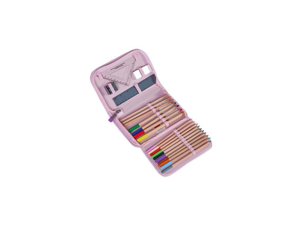 Plně vybavený: 2 tužky, 10 pastelek, 4 silnější pastelky, guma, ořezávátko, pravítko a trojúhelníkové pravítko