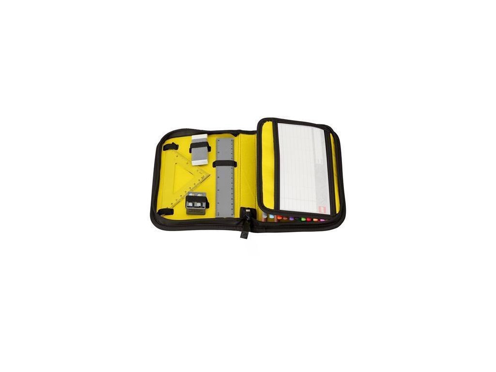Plně vybavený: 2 tužky, 10 pastelek, 4 silnější pastelky, guma, ořezávátko, pravítko a trojúhelníkové pravítko