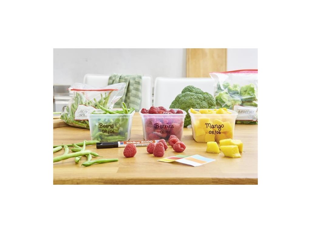 Permanentní popisovač vhodný pro popis uskladněných potravin v lednici nebo mrazáku.Vlastnosti: permanentní; rychleschnoucí; inkoust odolný vůči mrazu až do -25°C; voděodolný; odolný proti rozmazání; kuželový hrot;
