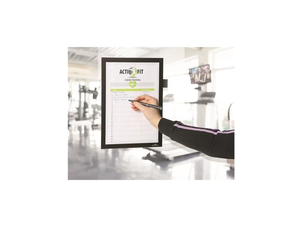 Prezentační rám na uložení poznámek, které potřebují dále upravovat. Ideální pro veřejné prostory, kde se vedou např. pravidelné záznamy o čase úklidu.Vlastnosti: samolepicí; rychlá a snadná výměna dokumentů; snadné připevnění na hladké povrchy; možnost vertikálního i horizontálního využití; možnost psaní přímo na papír uvnitř rámu; možnost vložení až 5 listů papíru (80g/m2); univerzální držák na pero; rám je z obou stran identický;