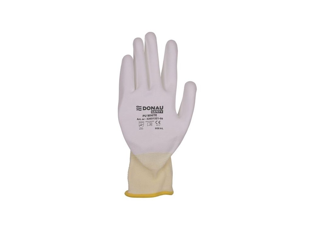 - Rukavice vyrobené z kvalitní polyesterové pleteniny v bílé barvě, v oblasti úchopu potažené bílým polyuretanem s vysokou odolností proti oděru