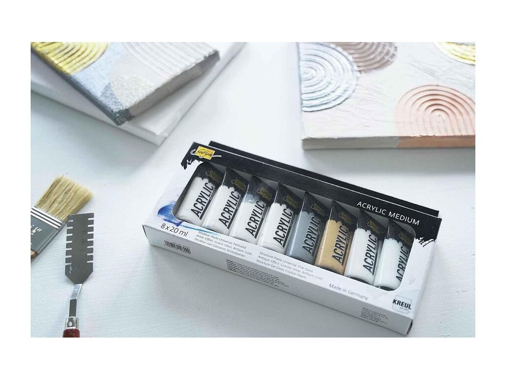 8 tub o objemu 20 ml, 2 x Structure Paste Universal, 1 x Structure Paste Fine-Sand, 1 x Structure Paste Antique-Effect, 1 x Structure Paste Granite-Silver, 1 x Structure Paste Brilliant-Gold, 1 x Structure Gel Gloss, 1 x Structure Gel Crystal-Pearls.