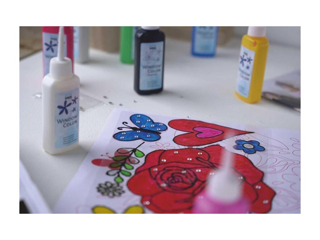 9 x WINDOW COLOR 80 ml – sněhová bílá, zlatožlutá, rubínová červená, růžová, královská modrá, májová zelená, hnědá, třpytivá zlatá a třpytivá stříbrná