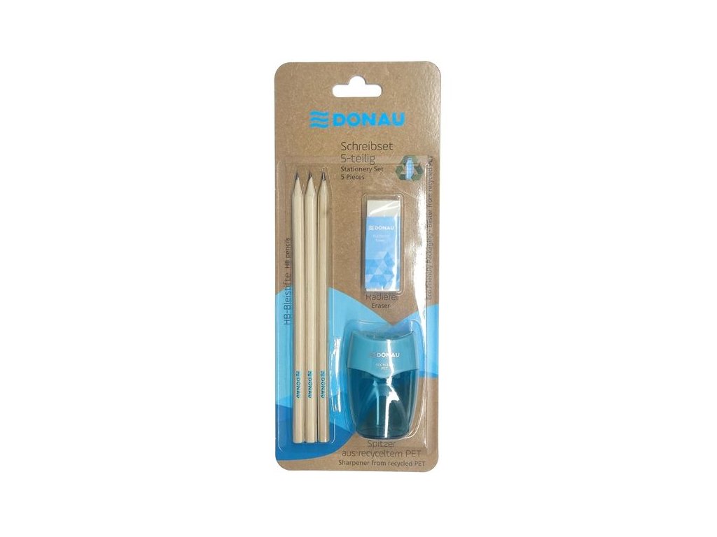 - Sada na psaní obsahuje: 1 dvojité ořezávátko z recyklovaného PET, 1 gumu, 3 tužky HB v přírodní dřevěné barvě
