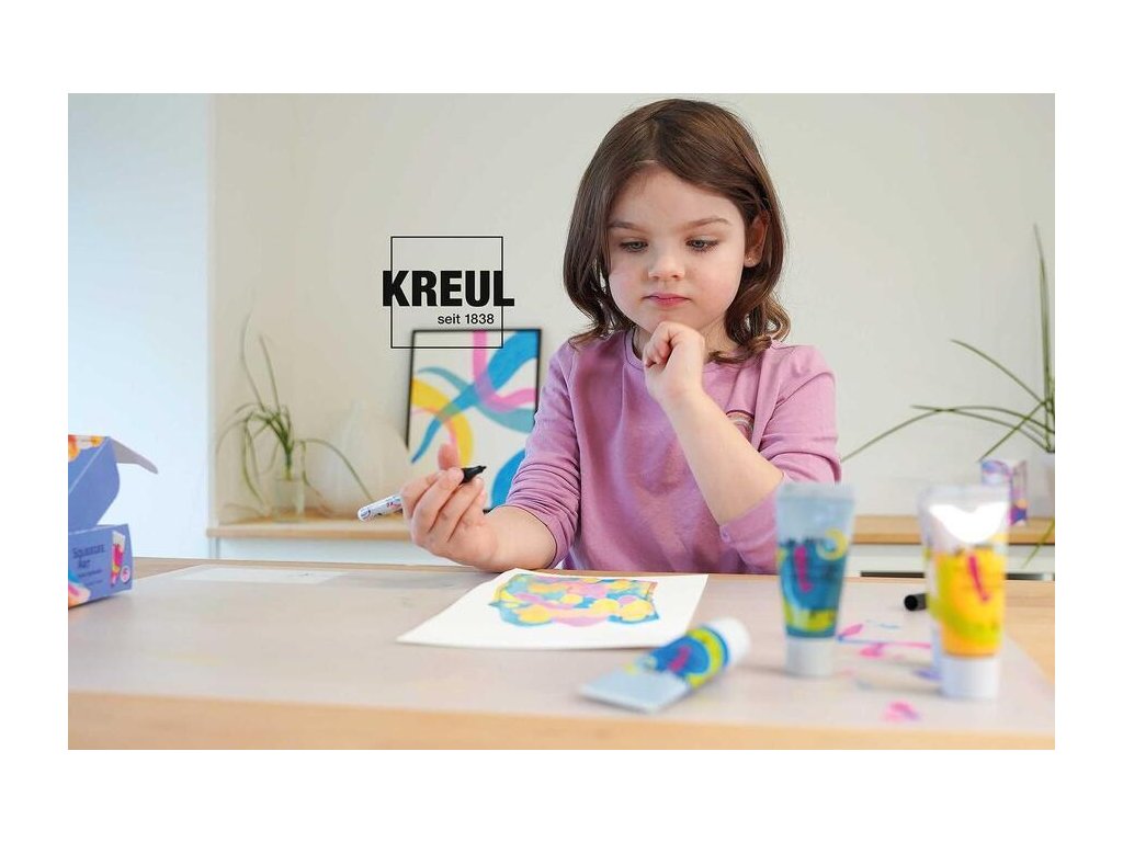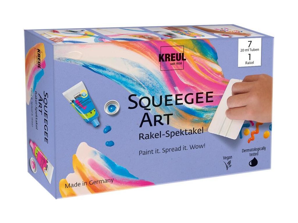 Squeegee Art: Naneste barvu, rozetřete – wow efekt. Technika tažení barvy stěrkou.Se sadou KREUL Squeegee Art vytvoříte zářivé barevné přechody, cool stírané textury i výrazné vzory, které budou pokaždé vypadat jinak. Žádné složité techniky – stačí barvu rozetřít stěrkou a je hotovo! Vysoce pigmentované dětské barvy KREUL Kids Art Artists’ Paints jsou vyrobeny v Německu, září brilantními odstíny a skvěle se mezi sebou míchají. A protože jsou pratelné, trocha cákanců vůbec nevadí – tady je dovoleno všechno, neexistuje správně nebo špatně. Každé dílo se tak stane skutečně jedinečným!