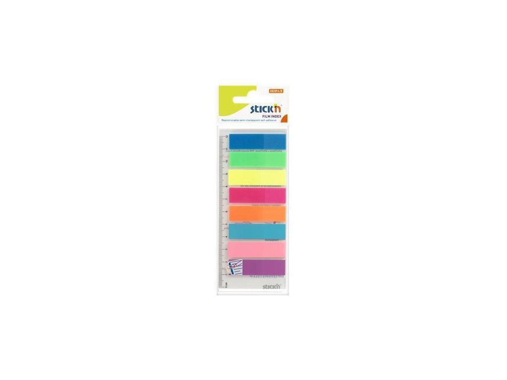 Průhledné a popisovatelné samolepicí záložky z plastu v jasných neonových barvách s pravítkem!Snímatelné beze zbytků lepidla