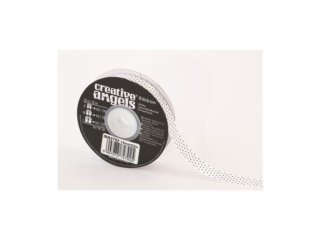 Saténová stuha, bílá s černými puntíky, 15 mm x 22 m, IBB2792
