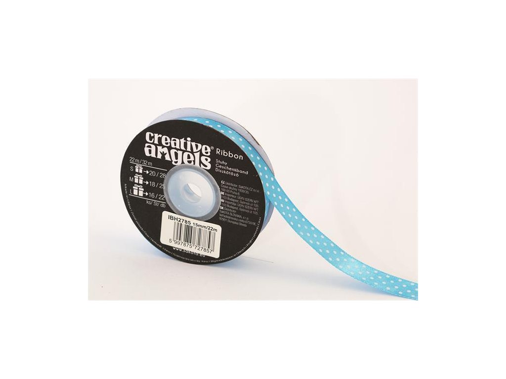 Saténová stuha, světle modrá s bílými puntíky, 15 mm x 22 m, IBH2785