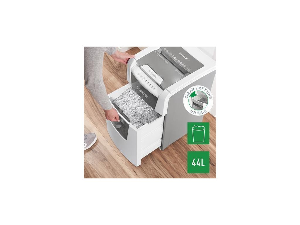 Funkce: technologie proti zaseknutí papíru (automaticky se zastaví a spustí zpětný chod); velkokapacitní odpadní nádoba; skartuje papír, svorky, sponky na papír; dotykové ovládání; mimořádně+ tichý provoz (při dodržování údržby pomocí olejových listů LEITZ).