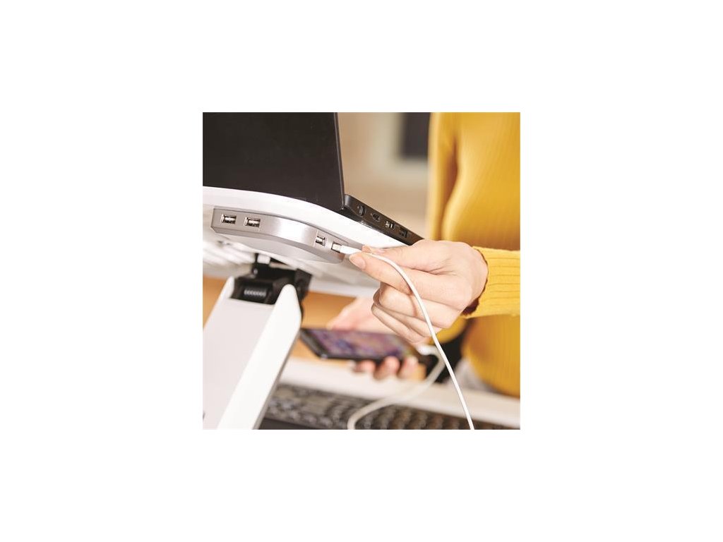 Elegantní základna pro notebook. Zvedne obrazovku notebooku do úrovni očí a tím tak zmírní napětí svalů paží a krku.Vlastnosti: systém organizace zapojení usnadňuje udržování pořádku; do velikosti 19"; integrovaný port se 4 USB (2x USB 2.0 typ A; 2x USB 2.1 typ A); snadné nastavení výšky (10,2-40,6 cm), úhlu náklonu (až 45°) a rotace (+/- 45°);
