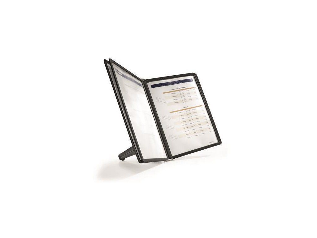 Držák na stůl s 5 prezentačními panely s kapsami SHERPA ve formátu A4. Polypropylenové panely s černým rámem a nereflexní, fotokopírovatelnou fólií.Vlastnosti: stabilní protiskluzový stojan na stůl, panely lze snadno a rychle vyměnit a lze je snadno označit díky indexovým záložkám s prázdnými vložkami
