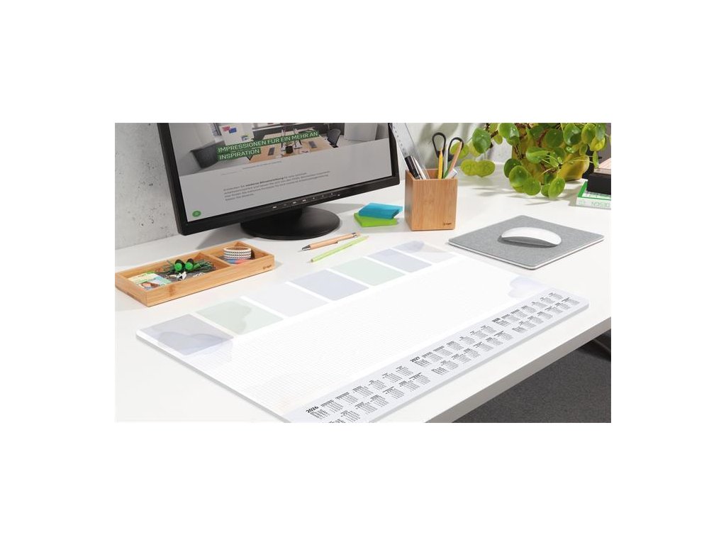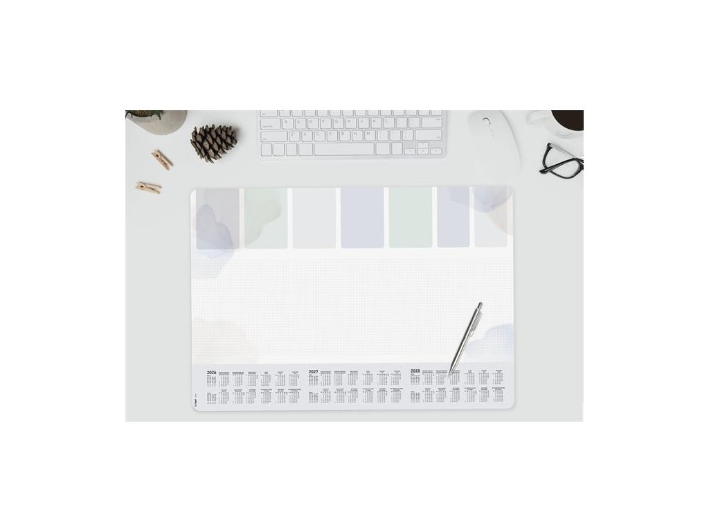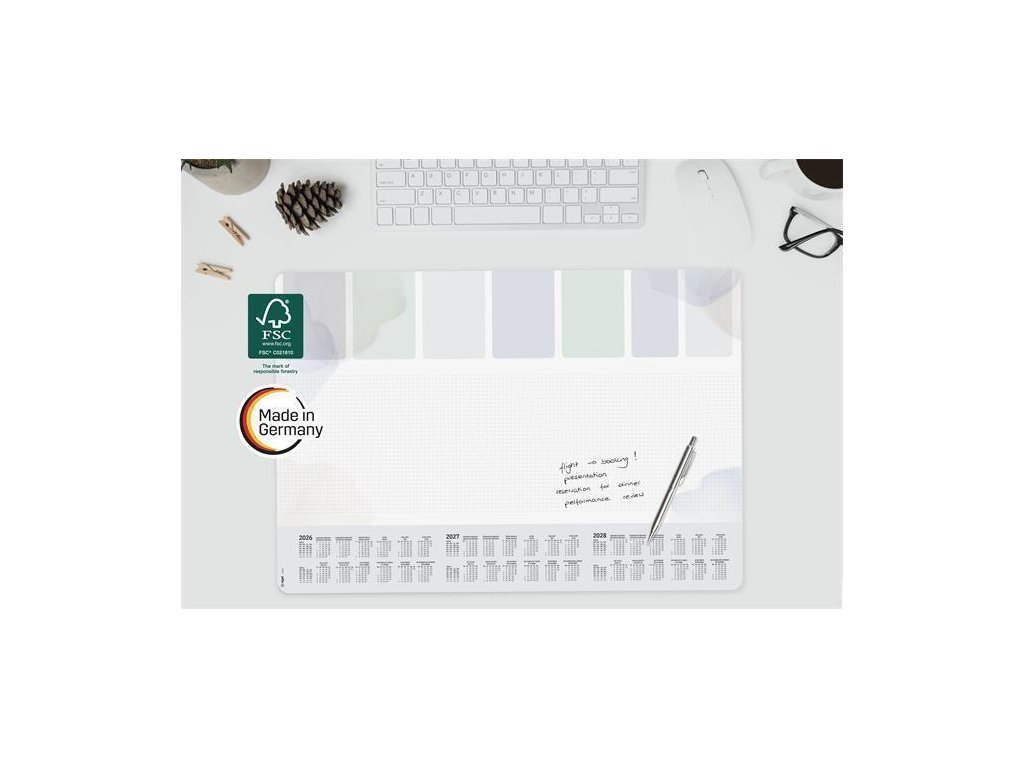 Kvalitní stolní podložka z papíru s gramáží 80 g / m2 s pevnou zadní stranou.S 3 ročním kalendářem (2026/2027/2028)