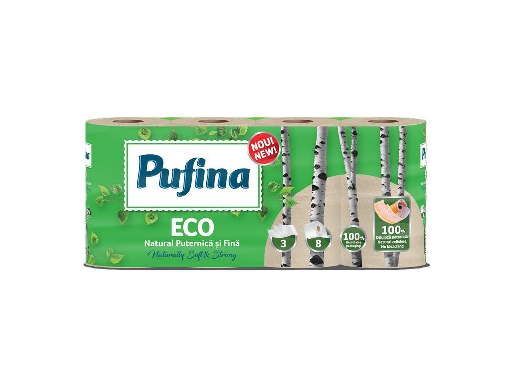 Toaletní papír Pufina Eco zajišťuje každodenní pohodlí ekologickým způsobem a je již téměř 20 let jednou z předních značek prémiových papírových výrobků.3-vrstvý toaletní papír - jemně parfémovaný, nebělený, bez chemických látek, dermatologicky testován