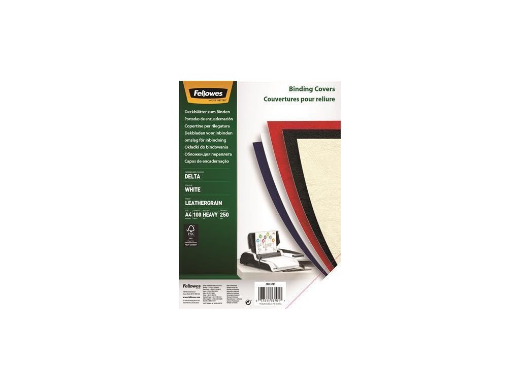 Zadní kryt "Delta", imitace kůže, matný, bílý, A4, 250 g, pro kroužkovou vazbu, FELLOWES