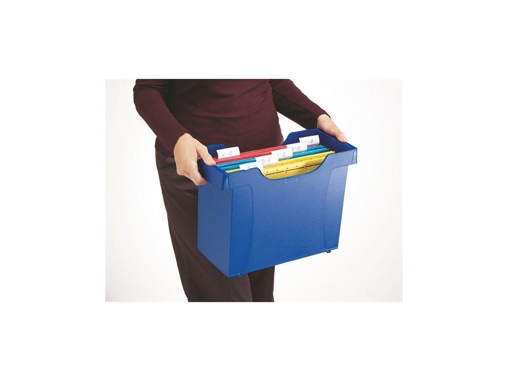 Zásobník na závěsné desky v designu řady Leitz PLUS.Vyrobený z pevného plastu. Postranní skryté výřezy pro snadné přenášení.