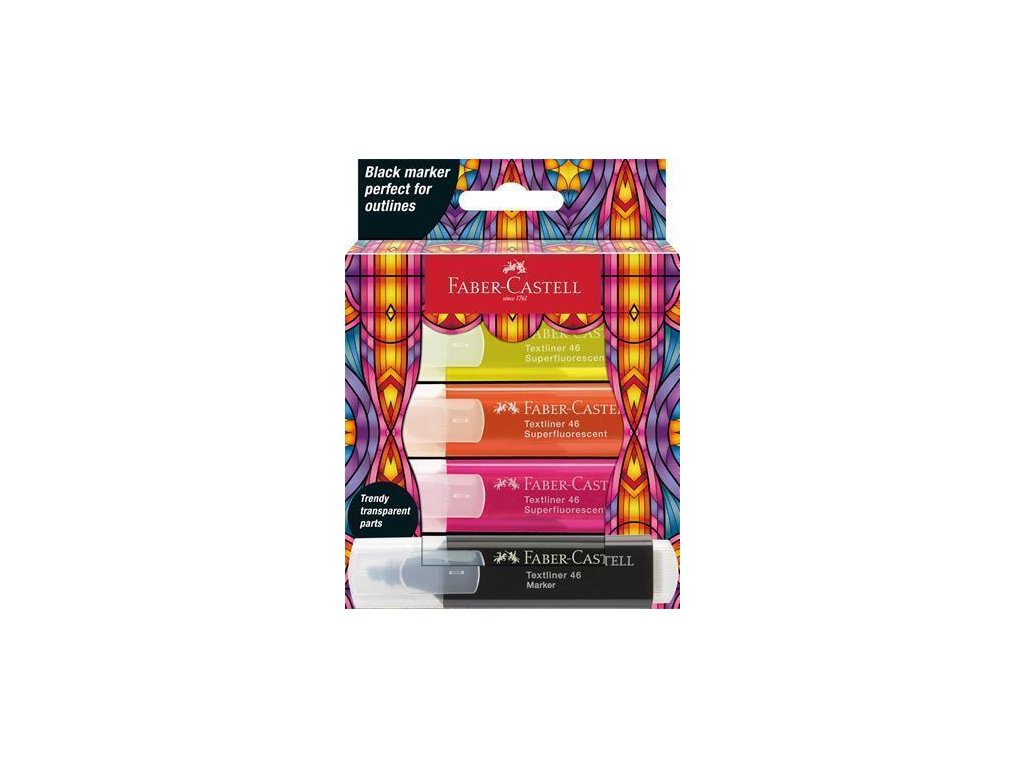 Zvýrazňovač "Glassy", 3 různé neonové barvy + černá, FABER-CASTELL 254693